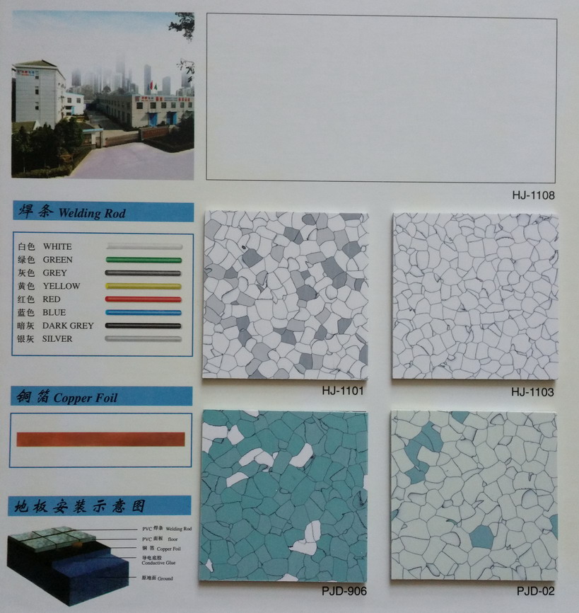 施工程序: 清掃地面—>鋪接地導(dǎo)電網(wǎng)—>引出地線—>涂導(dǎo)電膠—>鋪貼地板—>開V型槽—>鋪設(shè)焊條—>熱焊修整—>表面清潔—>檢測性能。