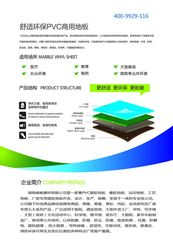 PVC地板是一種以半硬質(zhì)聚氯乙稀,PVC樹脂和天然石粉為主料,在高溫高壓條件下,經(jīng)過特殊生產(chǎn)工藝制成的綠色環(huán)保的新型輕體地面材料。產(chǎn)品紋路逼真美觀、超強(qiáng)耐磨,表面光亮而不滑,環(huán)保無毒、耐磨、耐刮擦,還能防滑、防水、防火等優(yōu)點(diǎn)?,F(xiàn)在世界上各大醫(yī)院,幼兒園都以此種材料作為地面裝飾首選材料。